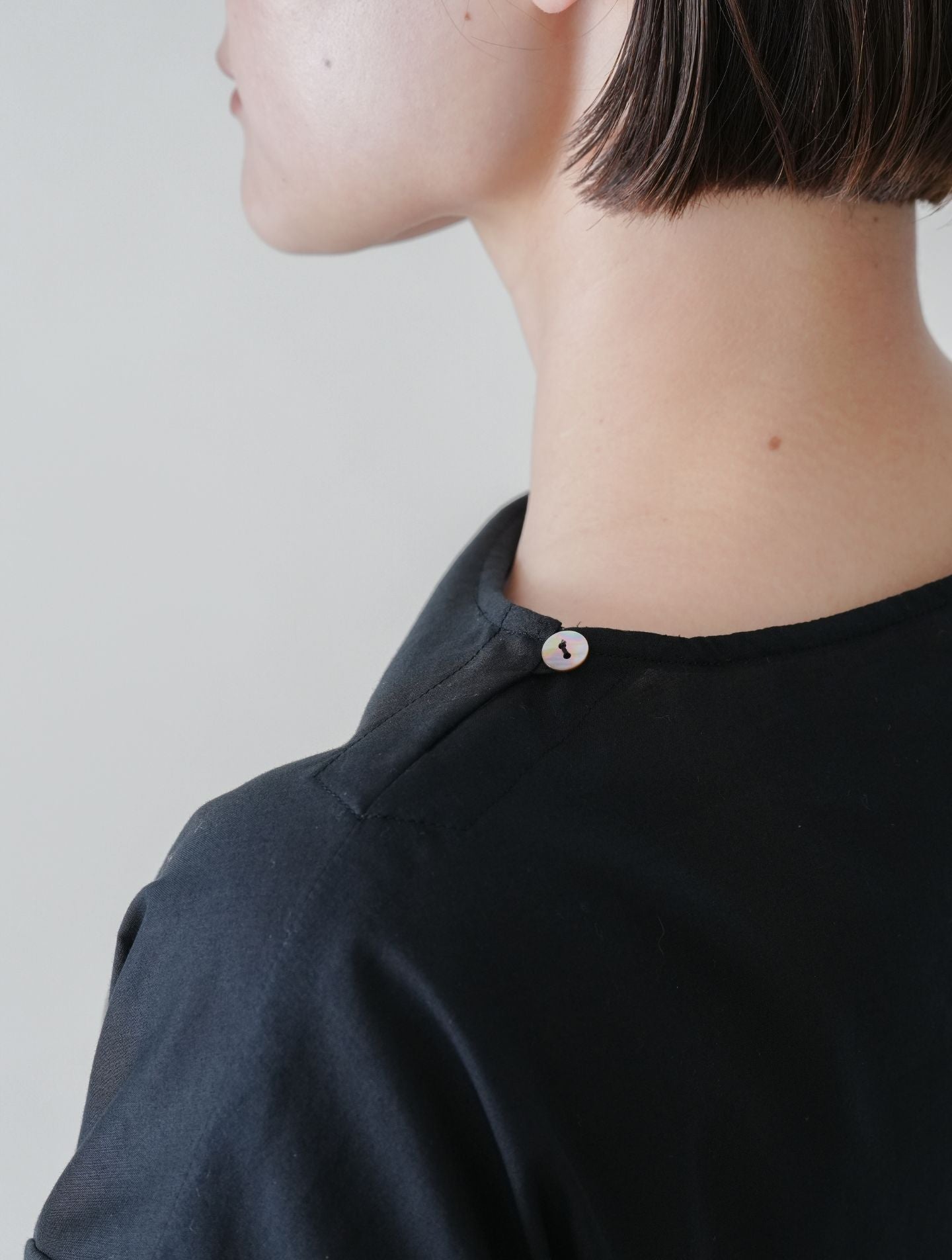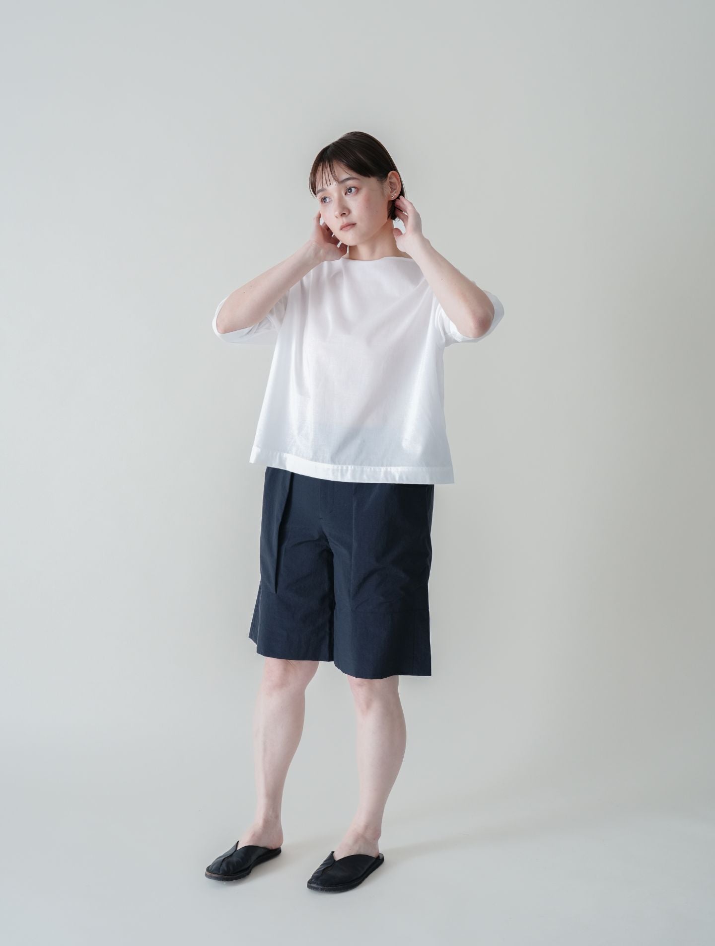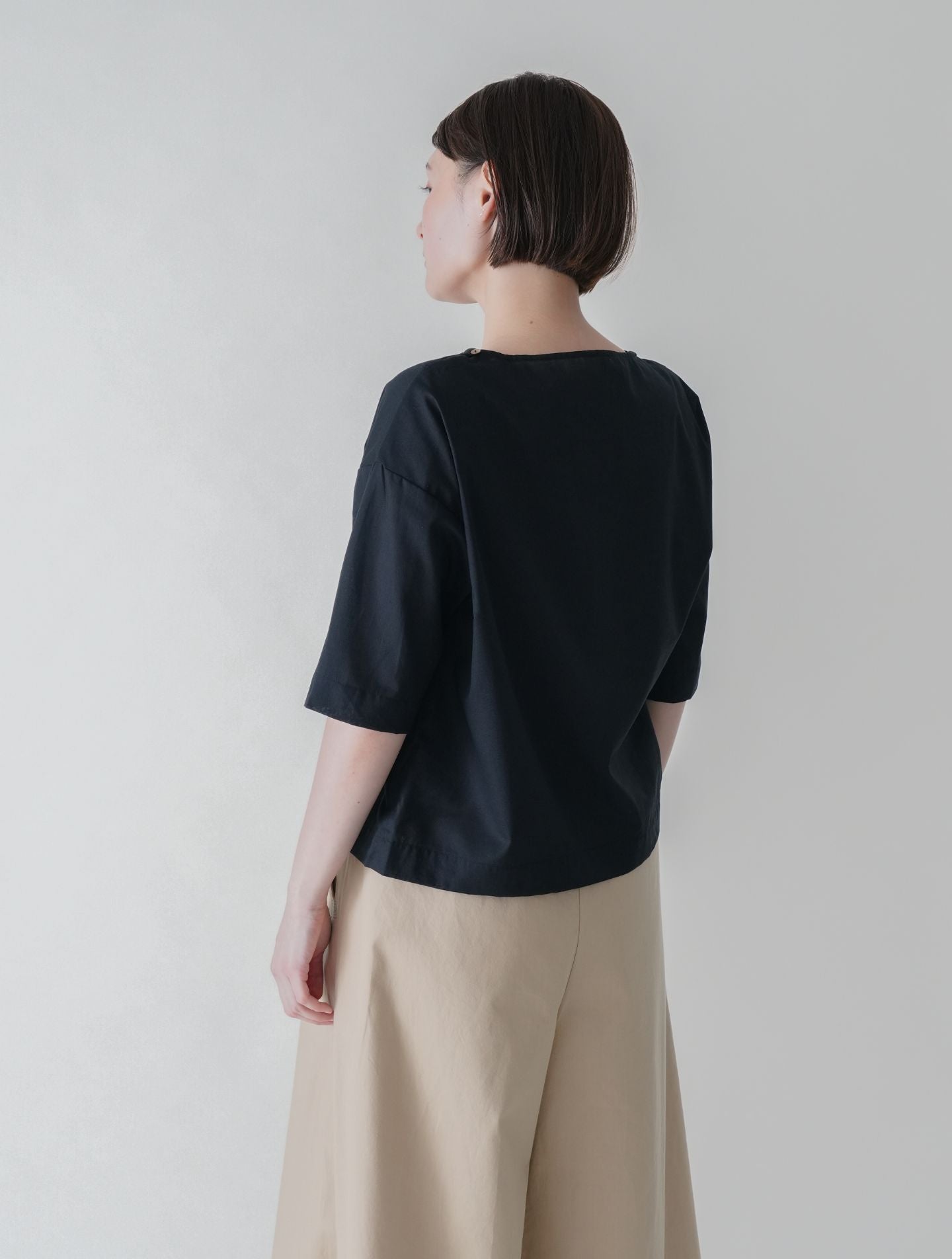 涼やかな透け感があり、真夏にもTシャツのような気軽さで着られる、プルオーバータイプのブラウス。形はあくまでシンプルに、すっきりと大人っぽい袖丈やネックラインにこだわりました。ネックの両サイドはボタン開きで着脱もスムーズ。カジュアルになりすぎないため、活動的なシーンから気軽なお出かけまで、幅広く対応する便利な一枚です。